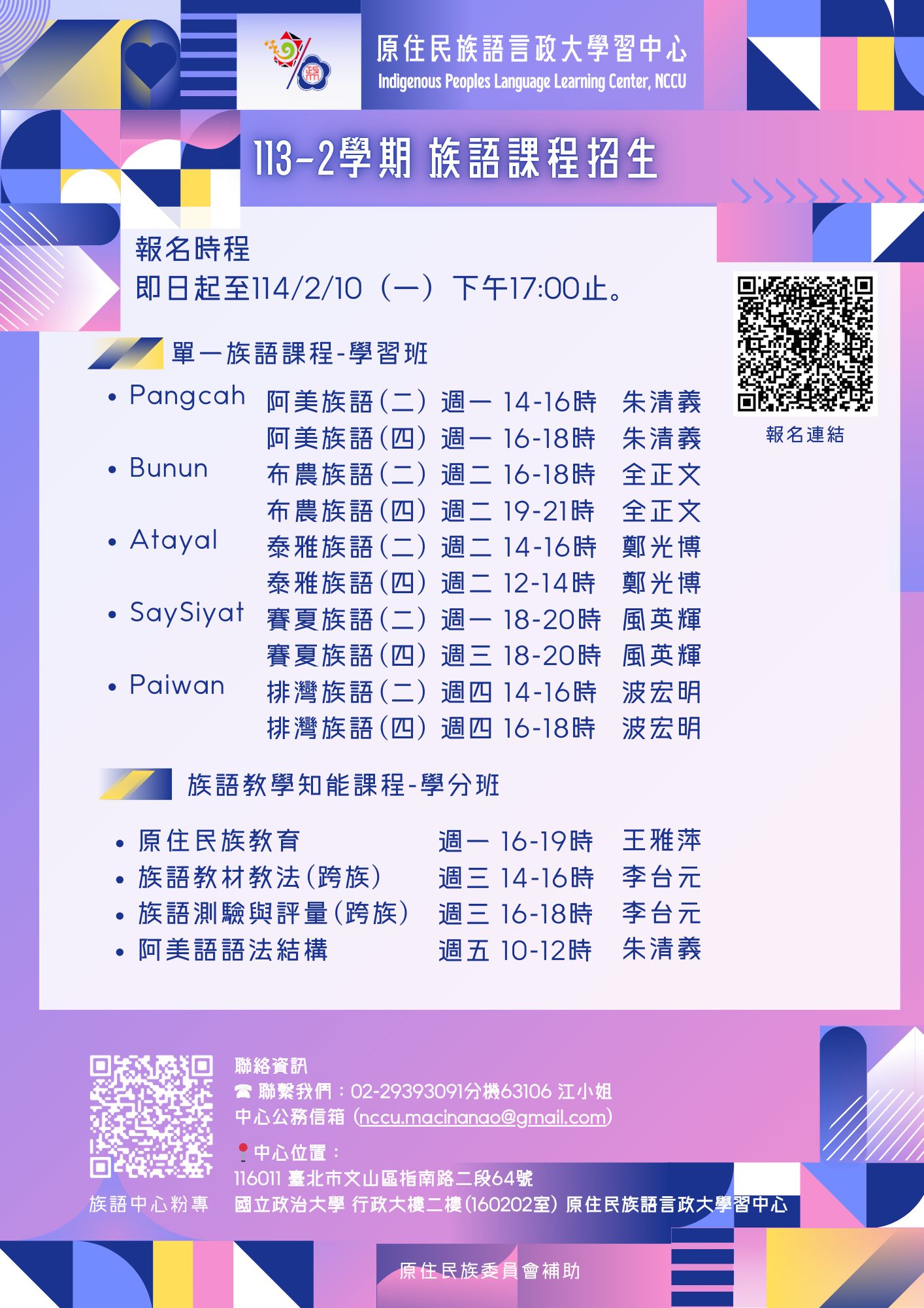 | 泰雅族語(二) | 113 | 下學期 | 單一族語學習班 |