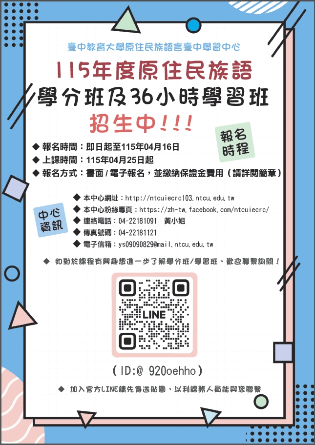 | 臺灣原住民族文化概倫 | 114 | 下學期 | 學分班 |